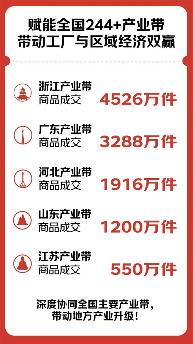 为提升地方产业带工厂/商家经营信心,京喜自营618赋能全国超244个产业带,挖掘细分市场机会,带动工厂与区域经济双赢。京喜自营618全周期内,浙江产业带商品成交4526万件,广东产业带商品成交3288万件,河北产业带商品成交1916万件,山东产业带商品成交1200万件,江苏产业带商品成交550万件,推动地方产业升级。
