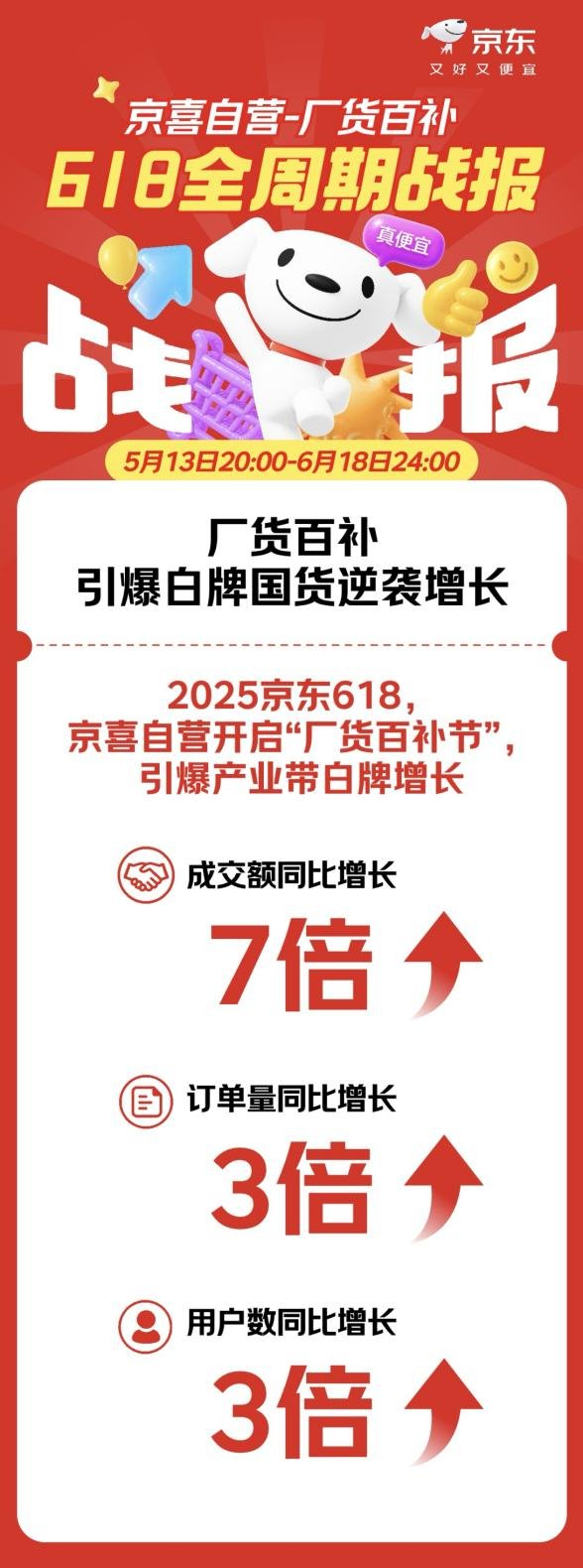 截至6月18日23:59,2025年京东618再创新高。根据5月13日晚8点至6月18日晚24点的全周期消费数据显示,京东旗下的京喜自营618成交额同比增长7倍,订单量同比增长3倍,用户数同比增长3倍,消费者购物热情充分释放。