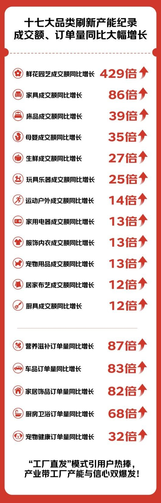 其中鲜花园艺成交额同比增长最高达429倍,家具、床品、母婴、生鲜、玩具乐器、运动户外、家用电器、服饰内衣等刚需品类成交额均爆发增长,营养滋补、车品、家居饰品、厨房卫浴、宠物健康五大品类订单量高速领跑。