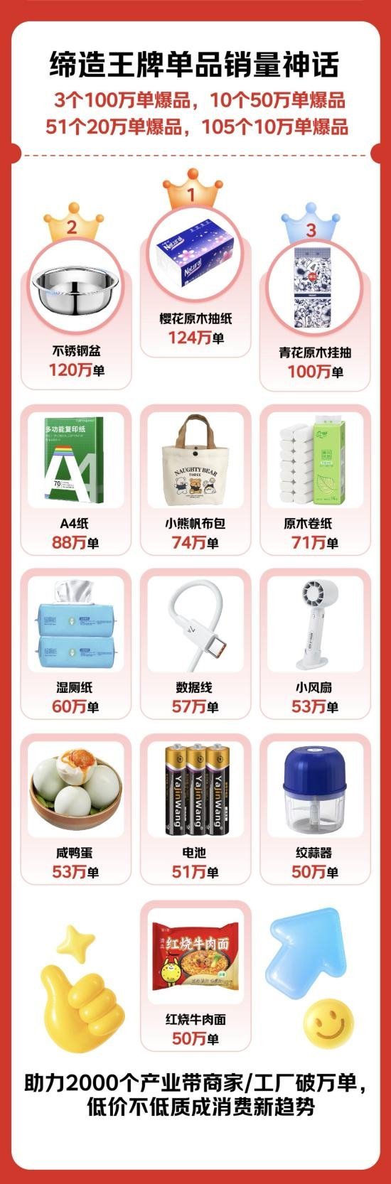 依托京东供应链优势,今年京喜自营618全周期助力2000个产业带商家/工厂订单破万,共孵化出3个100万单爆品、10个50万单爆品,以及51个20万单爆品、105个10万单爆品,低价不低质成为消费新趋势。