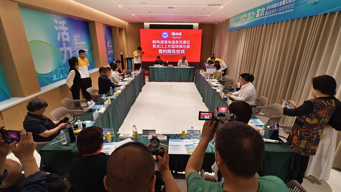 17日下午,黑龙江上东篮球俱乐部与新的球队冠名商——黑龙江鹤鸣湖湿地温泉风景区有限公司举行签约仪式。新赛季,俱乐部女篮一线队将以黑龙江上东篮球俱乐部鹤鸣湖风景区女子篮球队的名称,征战中国女子篮球联赛(WCBA)。俱乐部负责人和冠名商主要负责人均表示,在继续为黑龙江争得荣誉的同时,双方也将推动文旅体农全方位的融合,共同为社会经济发展作出贡献。