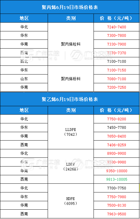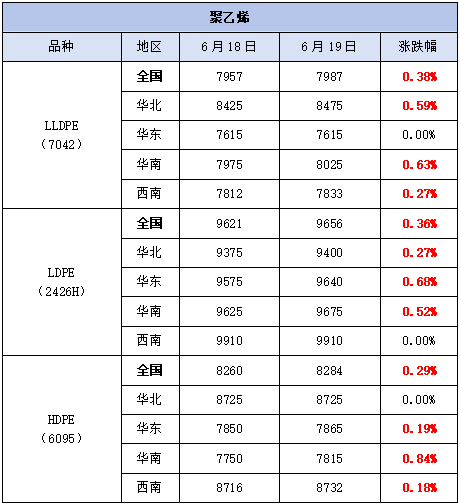 今日,聚乙烯市场延续上涨态势,价格以涨为主。LLDPE(7042)市场价格为7987元/吨,较上一工作日上涨30元/吨,涨幅为0.38%;LDPE(2426H)市场价格为9656元/吨,较上一工作日上涨35元/吨,涨幅为0.36%;HDPE(6095)市场价格为8284元/吨,较上一工作日上涨24元/吨,涨幅为0.29%。中东地缘危机持续发酵,国际原油价格连日上涨,成本支撑强劲,带动聚乙烯市场重心继续上移。当前,聚乙烯供需格局变动有限,随着检修力度减弱以及下游需求疲软,聚乙烯市场供应压力有增不减,对市场驱动不足。