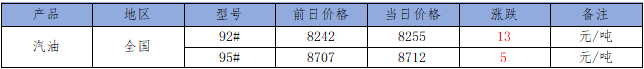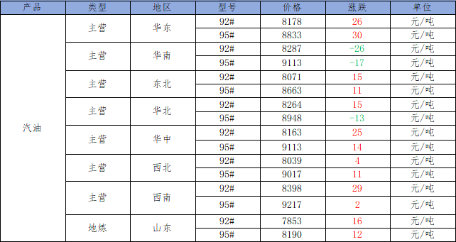 预计下个工作日主营汽油价格仍有小幅上调。地炼汽油价格企稳运行。