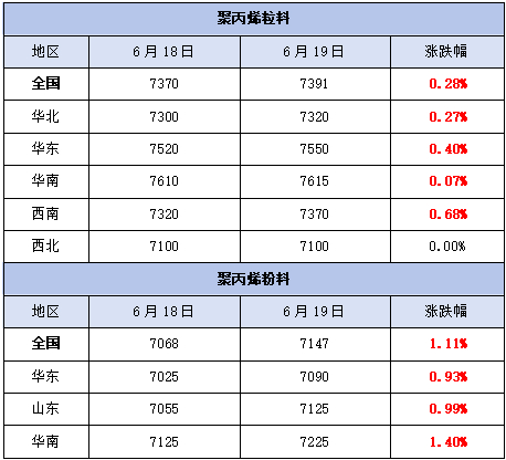 今日,聚丙烯市场偏强震荡,价格维持上涨。PP粒料均价为7391元/吨,较上一工作日上涨21元/吨,涨幅为0.28%;PP粉料均价为7147元/吨,较上一工作日上涨78元/吨,涨幅为1.11%。以色列与伊朗之间的冲突仍在进行,国际原油价格继续上涨,成本端支撑有利。然而,聚丙烯基本面表现平平,前期停车装置回归,供应有所增长;下游对聚丙烯需求依旧平淡,整体市场交投跟进依然不足。在成本端的强势支撑下,聚丙烯市场价格重心持续走高。