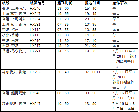 香港航空暑期增开的航班详情如下: