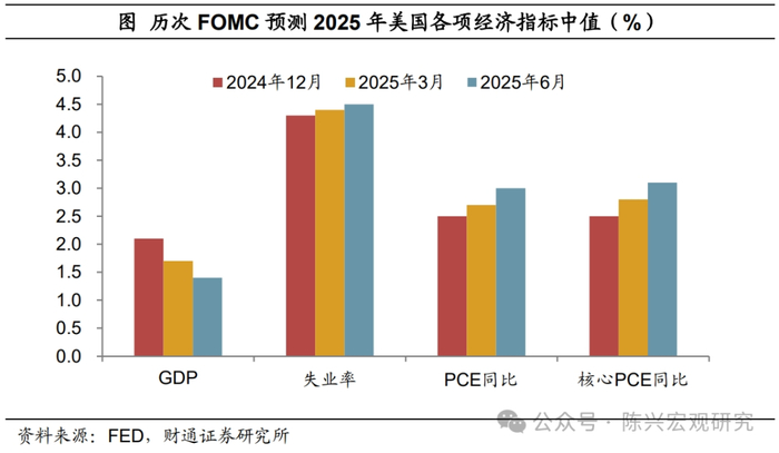 失业和通胀预期均有上调。本次声明中,就业方面,委员会维持劳动力市场状况稳定(labor market conditions remain solid)的判断,但删除了“失业率稳定在低水平”(stabilized at a low level)的措辞。通胀方面,委员会维持“通胀仍然偏高”(Inflation remains somewhat elevated)的表述。在经济指标预测中,美联储将2025年的失业率预期从4.4%上调至4.5%,PCE通胀预期从2.7%上调至3%。