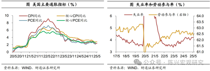我们认为,就业降温趋势不变,5月新增非农就业人数下降,今年以来,新增非农就业人数持续下调,或意味着当前就业水平存在一定程度的高估。此外,关税和政府裁员的影响正在逐渐显现,随着联邦政府削减开支,未来对承包商、大学等工作岗位的需求或也有减少。通胀降温,反弹动能不强,5月通胀略有反弹,主要受到电价和核心商品通胀回升的影响,而核心服务通胀仍在降温,核心CPI保持平稳。目前关税尚未完全显现在通胀中,此前企业抢进口、囤库存,关税成本转嫁给消费者或仍需一定时间。