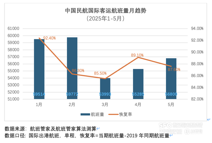2019年以来,受市场需求、航权限制等诸多因素影响,国际航线市场一直处于恢复期。航班管家统计数据显示,2024年全年中国民航国际市场整体恢复至2019年的74.8%,而进入2025年,1-5月单月民航国际客运航班量恢复率均高于85%,恢复水平进一步提高。