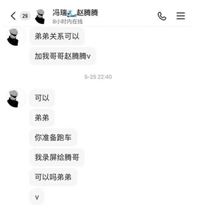 据谢先生提供的聊天记录显示,冯瑞在私信中要求小风准备好“跑车”可以加微信,并承诺会录屏给赵腾腾,小风打赏跑车后,冯瑞又表示加不了赵腾腾微信,理由是自己刚才忘记录屏,只能先加他的微信。