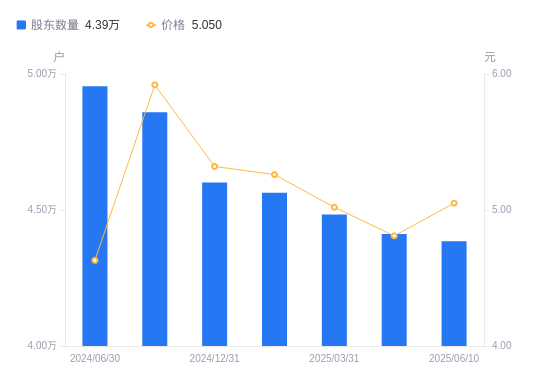 近一年(2024年6月30日至2025年6月10日),五矿新能A股股东户数从4.95万户,减低至4.39万户,降幅11.50%,区间股价上涨9.07%。