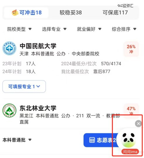 QQ浏览器也选择整合其他产品资源提升志愿推荐能力。QQ浏览器在AI志愿填报界面的右下角添加了一个“问问ima”的入口,点击后会跳转到腾讯的AI智能工作台ima上,通过该APP提供AI咨询服务。不过这需要用户先下载ima APP。
