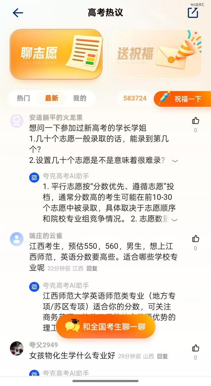 夸克的解决方案为考生和家长提供了一个专门用来交流的“聊志愿”功能,考生与家长可以通过发帖求助的方式提问,夸克高考AI助手会根据提问进行回答,其他人也可跟帖讨论或给出自己的建议。不过目前回答的主力还是夸克高考AI助手。