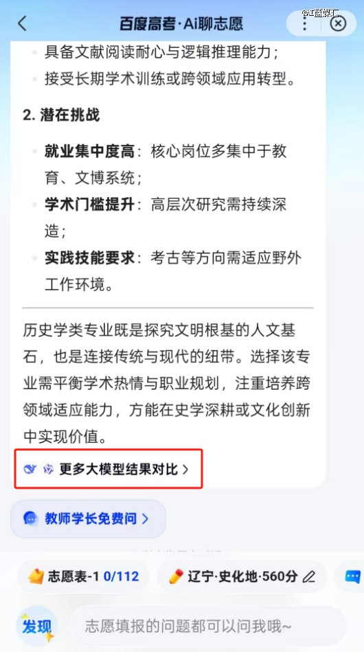 和去年一样,百度APP通过AI聊志愿功能让考生和家长与专门设计的文心·高考版大模型对话。不过今年百度APP还集合了DeepSeek和通义千问这两个大模型,让用户可以直接对比不同大模型的回答。