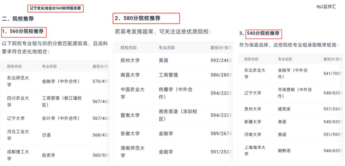 通过这个超级搜索,我们也能大致看出夸克眼下推荐志愿的逻辑,那就是在考生的高考分数上增减20分来筛选学校。比如我们输入的是560分,那么夸克就分别以580分、560分、540分为基础帮我们筛选学校。