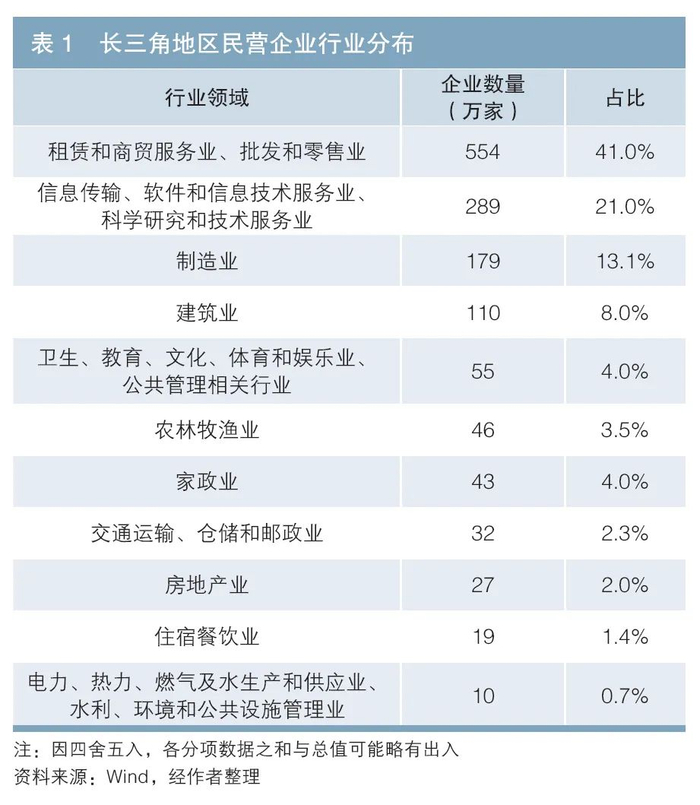 从万得(Wind)数据(下同)来看,长三角地区民营企业1超1363万家,占当地企业数量的95%,行业主要分布在租赁和商务服务业、批发和零售业等(见表1),显示出长三角地区作为区域现代服务业集聚中心和制造业高地,数字经济与创新驱动优势突出,民营企业在地区经济发展中发挥着重要作用。