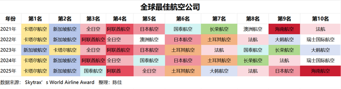 2025年前十中,卡塔尔航空、新加坡航空、国泰航空、阿联酋航空、全日空、大韩航空、日本航空以及海南航空这八家航空公司,均来自亚洲地区。亚洲航司在Skytrax全球榜单中长期占优,并非偶然。