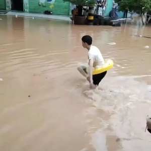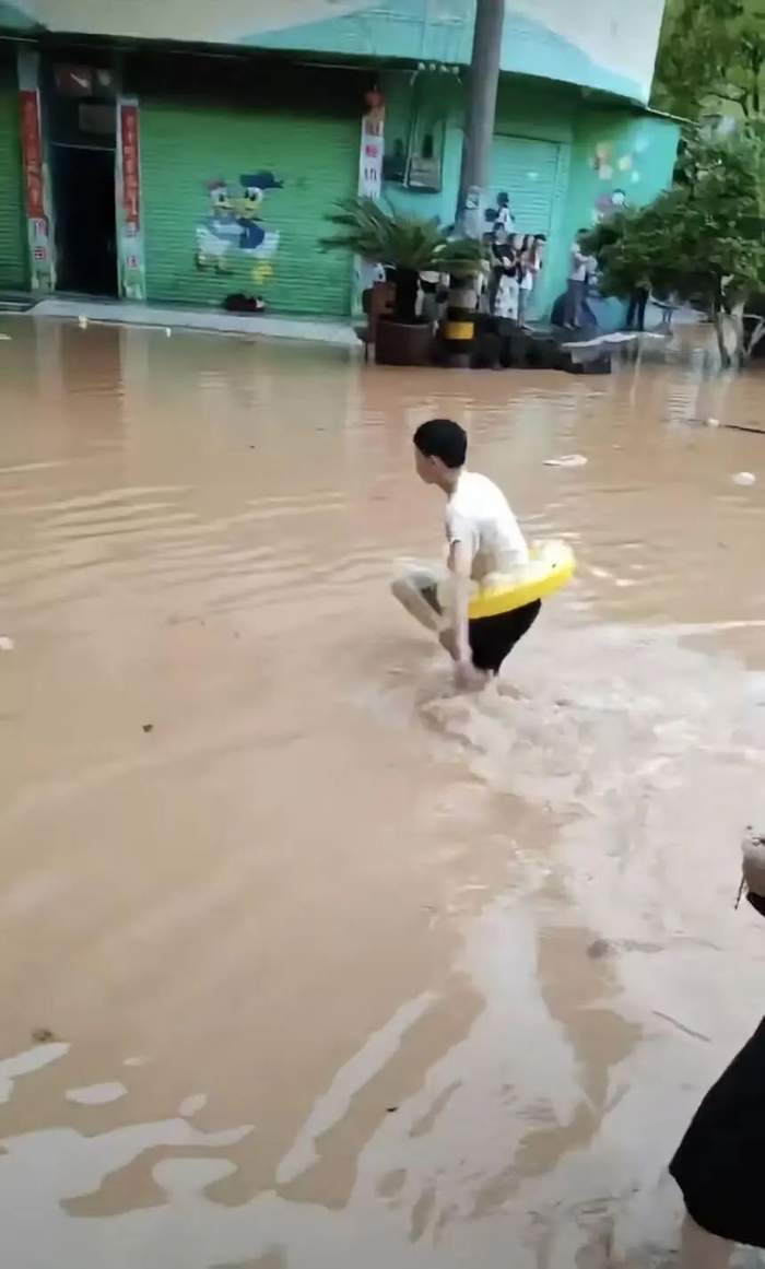 当地居民发布的视频显示,当地部分地方渍水严重。因为19日正是中考第二天,一早就有一名白衣考生带着游泳圈,游过被淹的地方。