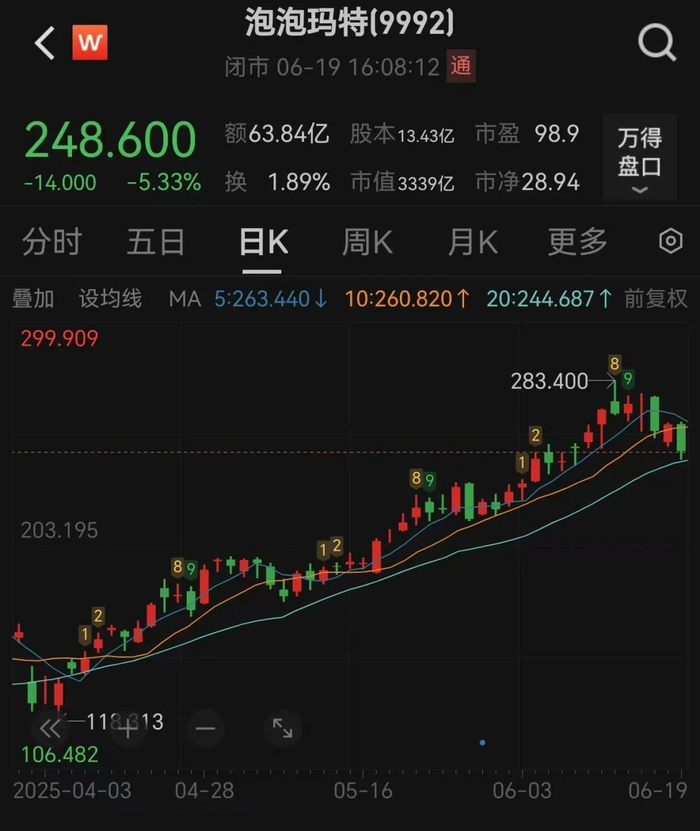 本周泡泡玛特(09992.HK)开始调整,6月19日再次跌超5%。