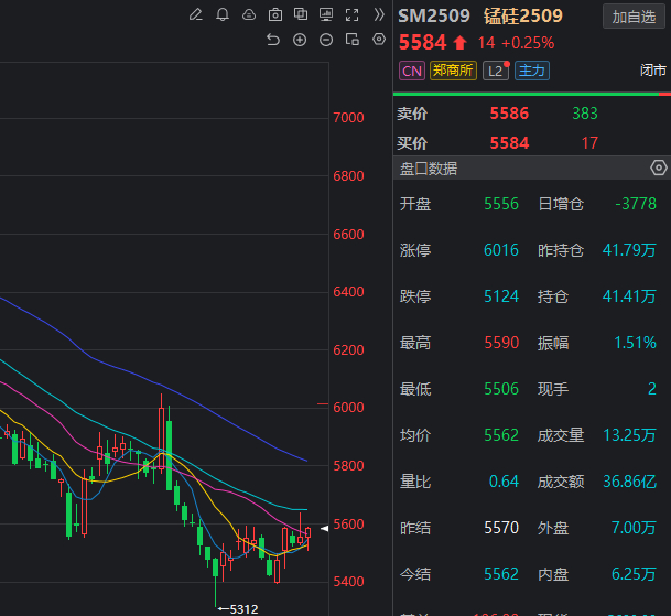 今日SM2509合约今日呈现阶梯式震荡上行格局,全天振幅84点,开盘5556点后短暂下探日内低点5506点,精准测试5500点整数支撑,随后稳步攀升至5590高点,尾盘收于5584点,日涨幅28点。日线收出带较长下影线的小阳k线,显示下方承接力量增强。成交量环比锐减8.2万手至13.3万手,持仓量减少3778手至41.4万手,仓单增加650张至95545张。MACD红柱继续扩张,双线负值收敛负向收窄,形成经典底背离结构,中短期下跌动能衰竭,反弹趋势逐步确立。KDJ三线加速上行,短期存在技术修正需求。日内最高价逼近布林中轨,布林通道口持续收窄,但当前价格仍处于中轨与下轨之间的修复通道,需突破中轨才能确认趋势反转。收盘价站稳MA5、MA10及MA20形成的密集支撑区,形成短多格局,中长期MA40与MA60仍呈空头排列,压制上方空间。综合来看,量能锐减伴随持仓下降,今日上涨主要由空头回补驱动,而非新增多头主动进攻。仓单再度累积印证现货套保压力,制约期货上行空间。技术面反弹动能仍在,但量能不足可能引发5500-5600区间震荡。(仅代表我方观点,不做投资建议,市场有风险,投资需谨慎)