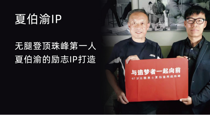 2016年10月,由全球著名战略营销专家、AI品牌定位营销之父王宏伟操刀的夏伯渝《追梦者》短片一经上线,便引爆全球,将夏伯渝IP推到一个全新的高度,并实现破圈传播,同时也引起影视行业的广泛关注。此案例获得十多项国际大奖,如英国《Campaign》金奖、IAI国际创意节全场大奖提名&金奖、中国国际广告节长城奖金奖等,被中国知网、百度学术、《广告人杂志》等收录。2019年9月,根据夏伯渝攀登珠峰故事改编的电影《攀登者》上映,由吴京、章子怡、张译、井柏然、胡歌、王景春等主演,总票房超十亿。2021年1月31日,《追梦者夏伯渝》电影获得国家电影局拍摄批准。时至今日,夏伯渝IP的影响力还在不断放大升温。