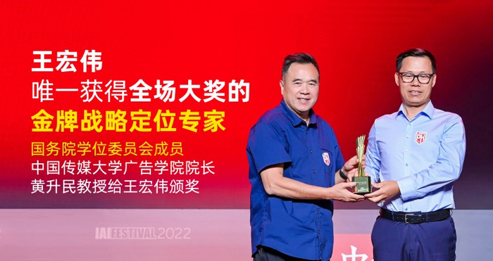 国务院学位委员会成员、中国传媒大学广告学院院长黄升民教授为王宏伟颁发全场大奖&金奖;