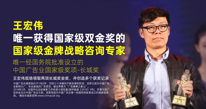 王宏伟是国务院唯一批准的中国广告行业国家级奖项长城奖,唯一双金奖获得者;