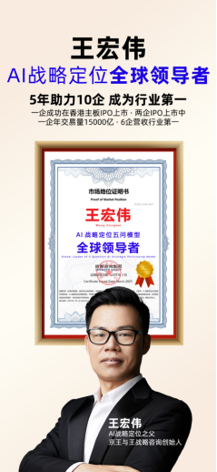 2025年3月,中国北京——全球知名战略咨询品牌京王与王创始人、AI战略定位之父王宏伟,获得由国际权威机构颁发的"AI战略定位全球领导者"(Global Leader in AI Strategic Positioning)市场地位认证。该认证标志着AI战略定位之父王宏伟先生,在AI人工智能战略领域的开创性贡献获得全球权威专业认可,其创立的"AI战略定位方法论"正式跻身世界顶级商业战略体系行列。打破西方百年垄断,实现AI时代的全球引领。