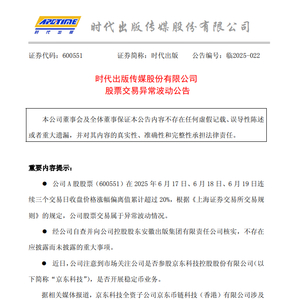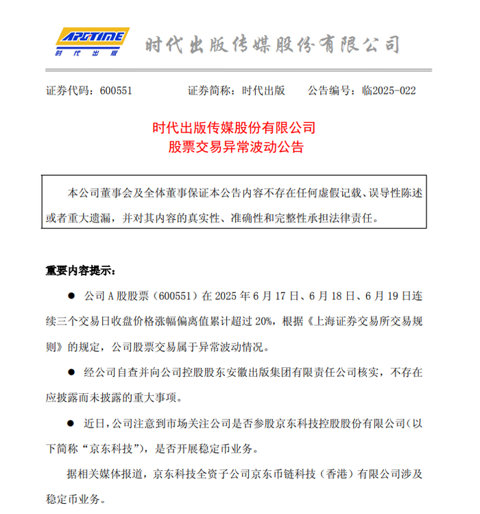 6月19日,时代出版(600551.SH)公告称,公司A股股票在2025年6月17日、6月18日、6月19日连续三个交易日收盘价格涨幅偏离值累计超过20%,属于异常波动情况。公司注意到市场关注是否参股京东科技,是否开展稳定币业务。