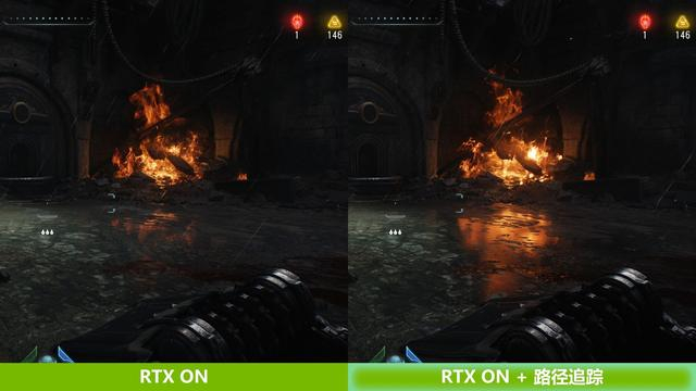 在《毁灭战士:黑暗时代》中,有较多的火焰场景,从上至下分别体现了路径追踪的阴影、反射以及全局照明效果。尤其在最后一张,增加了路径追踪全局照明之后,未着火处的墙壁以及枪身,都被染成了红色,更能体现屋内的滚滚热浪。