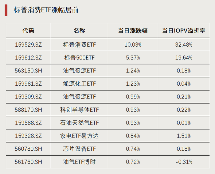 标普消费ETF(159529)上涨10.03%,领涨全市场ETF,溢价率高达32.48%。