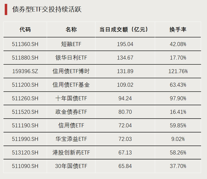 债券型ETF交投持续活跃,短融ETF(511360)成交额近200亿元,信用债ETF博时(159396)换手率高达121.76%。
