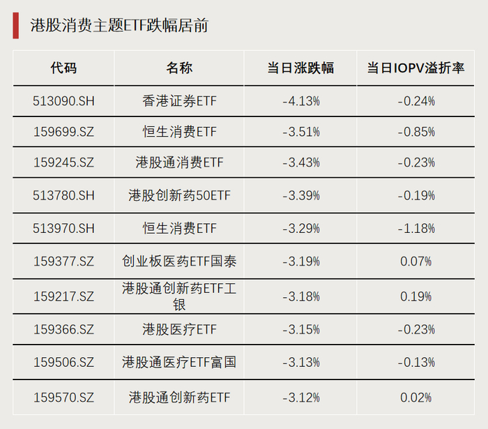 港股消费和医药板块再度回调,多只相关ETF跌超3%。香港证券ETF(513090)、恒生消费ETF(159699)、港股通消费ETF(159245)跌幅居前。