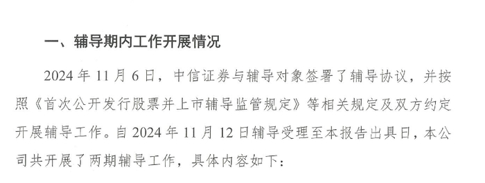 据了解,2024年11月6日,中信证券与摩尔线程签署了辅导协议,并按照《首次公开发行股票并上市辅导监管规定》等相关规定及双方约定开展辅导工作。从辅导受理至工作完成报告出具日,中信证券共开展了两期辅导工作。