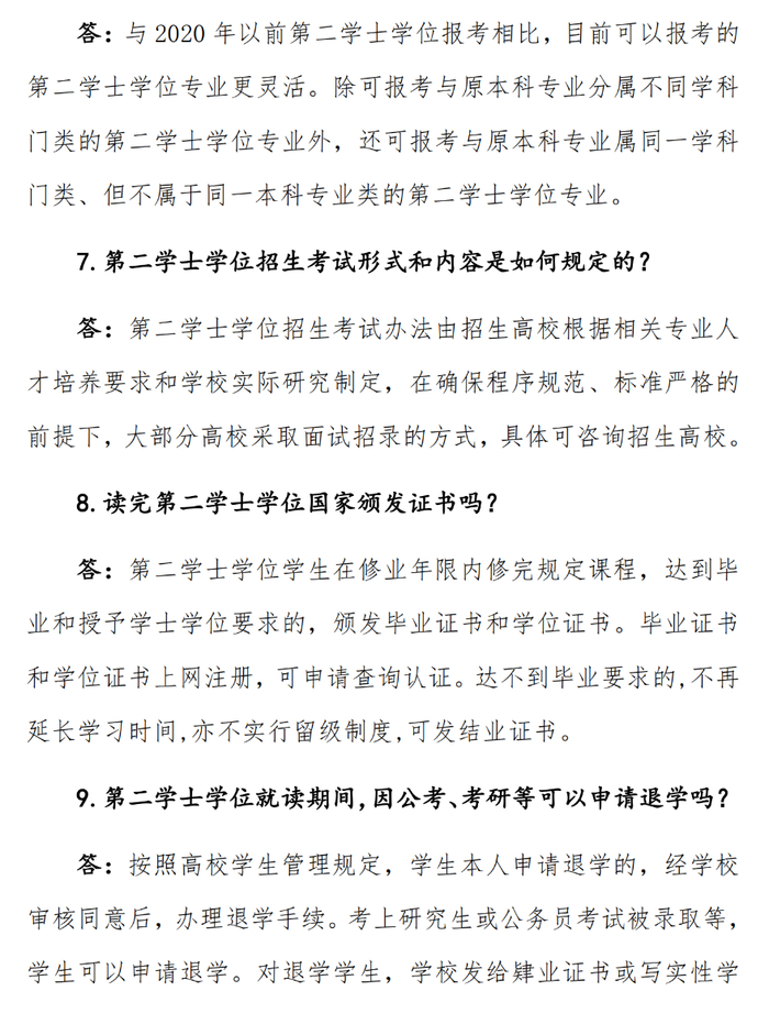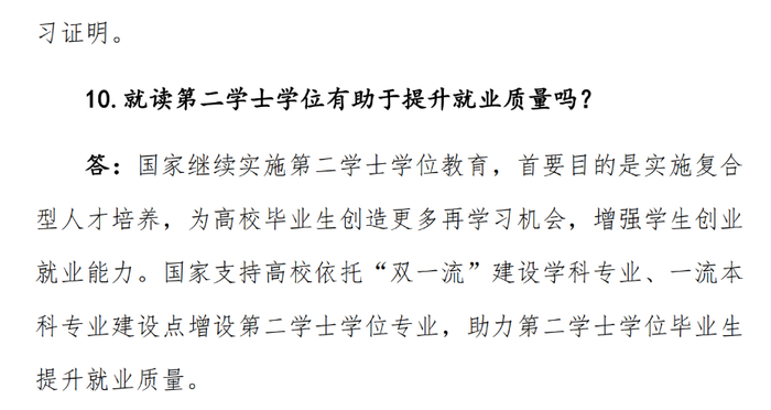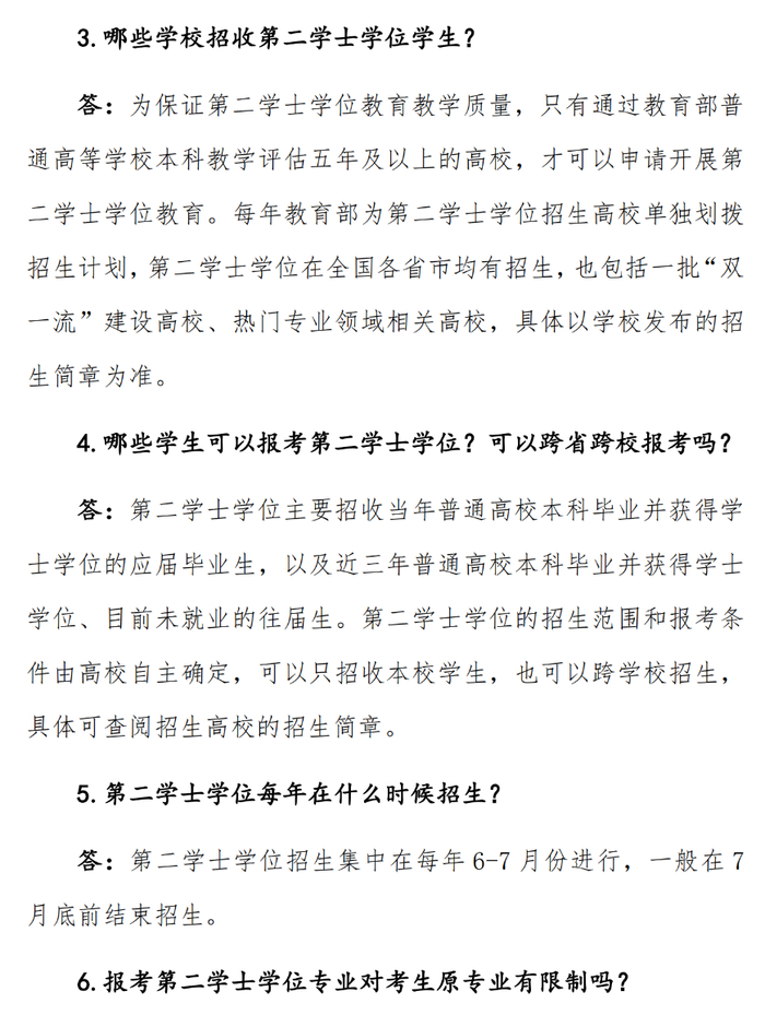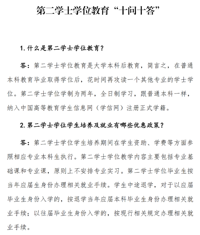 四、加强宣传。各高校要充分发挥好第二学士学位教育培养复合型人才的重要作用,为高校毕业生创造更多再学习机会,增强学生就业创业能力。招生院校和生源院校教务、招生、学院等多部门协同联动,根据教育部相关文件认真做好招生宣传引导工作,积极开展面向考生和家长的政策咨询,深入细致做好第二学士学位的政策解读工作(第二学士学位教育“十问十答”见附件4),及时回应社会关切,营造良好氛围,确保工作落实到位。