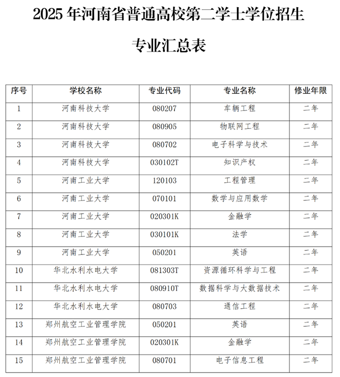 为贯彻落实党的二十大精神,加快建设高质量教育体系,全面提高人才自主培养质量,深入贯彻落实党中央、国务院稳就业工作部署,充分发挥第二学士学位教育培养复合型人才、缓解就业压力的重要作用,按照《教育部高等教育司关于做好2025年度第二学士学位教育工作的通知》要求,我省结合实际制定了《2025年河南省普通高校第二学士学位教育实施办法》,现通知如下: