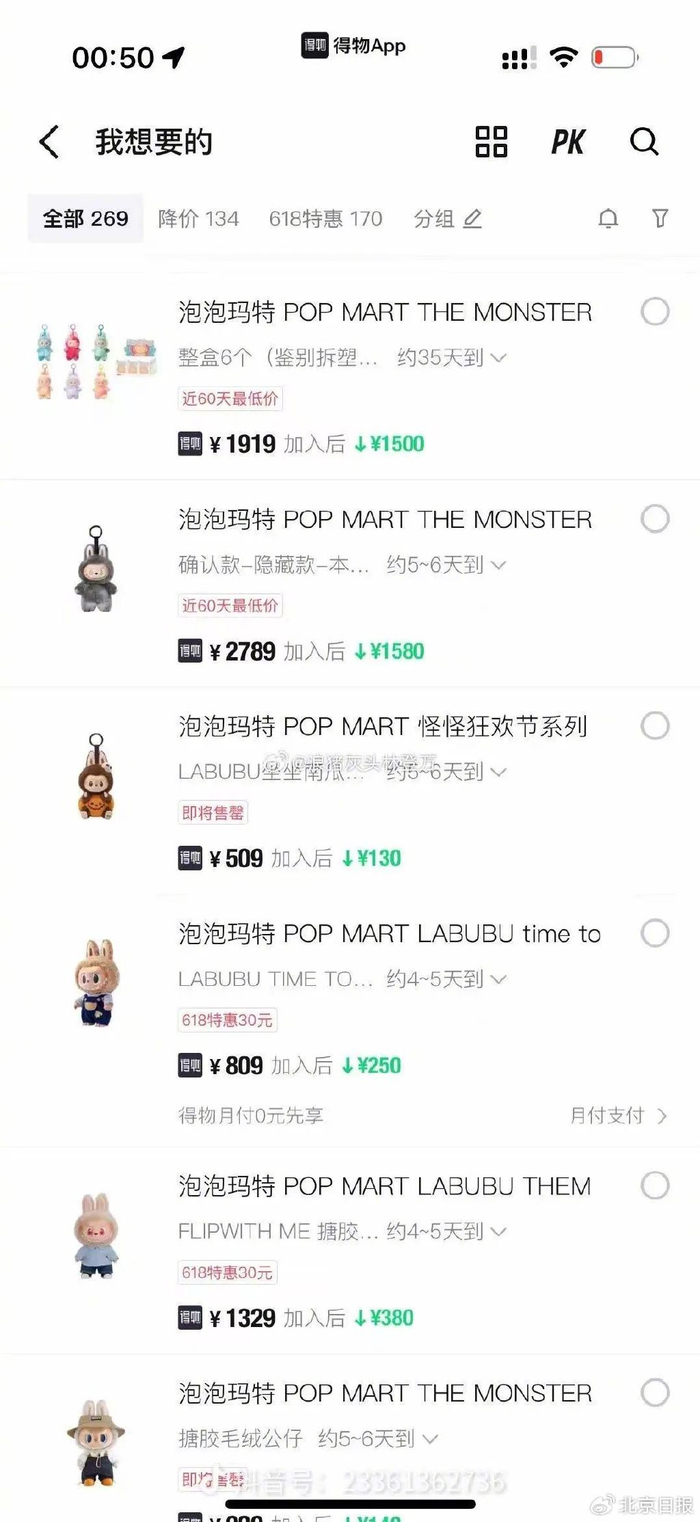 今日,受到官方补货影响,Labubu在二手市场的交易价格应声下跌。根据某潮玩二手交易软件的数据,该系列盲盒价格普遍下跌约50%。或受相关消息影响,泡泡玛特今天股价大跌约6%!