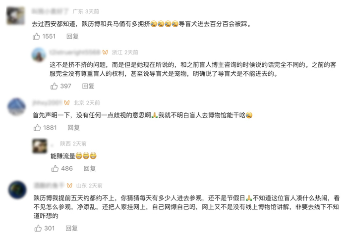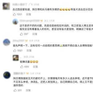 该事件发酵两天,网友观点出现明显分歧。认为陕博“没错”的网友表示:博物馆内人流量大、环境复杂,博物馆提出安排志愿者协助参观并看管导盲犬的方案比较可行,而且能满足盲人的参观需求。甚至有人认为,盲人小伙首发视频“断章取义”有“碰瓷”之嫌。而认为陕博“错了”的网友们则强调,不管你是否提供替代服务,你拒绝了导盲犬进入参观,实际上就没有保障盲人借助导盲犬自主参观的权利。而“自主权利”对残障人士来说,至关重要。