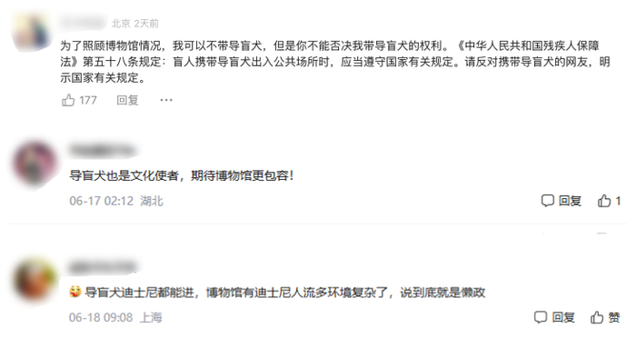 由此看来,法律上虽然有明确要求,但各家博物馆在落实过程中其实是“看着办”的。比如客流量大、环境暗、语音导览不充分等等现实状况,都是这些博物馆“拒绝导盲犬”的原因。可深究之后会发现,所有的理由都能归结到一个词上,那就是“观念”。看部分网友的评论会发现,人们觉得博物馆已经为残疾人提供“便利”了啊,导盲犬还不一定熟悉环境,志愿者导览不是更好吗?