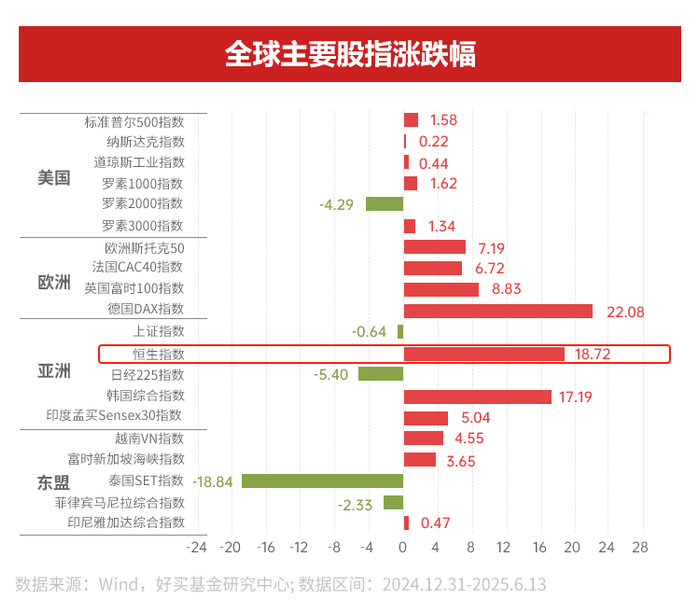 截至6月13日,恒生指数年内涨约20%,在全球主要股指中涨幅靠前,仅次于德国DAX指数表现。