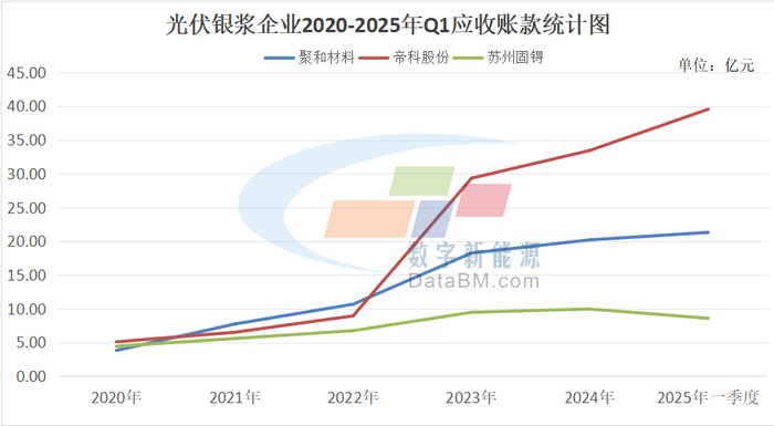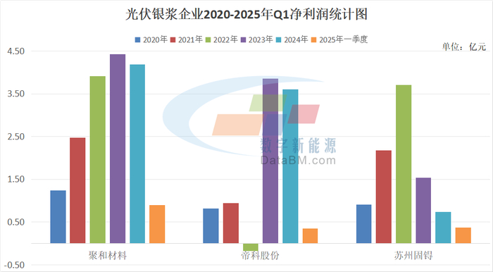 受此影响,光伏银浆企业也在近几年迎来了业绩的爆发增长。在2020-2024年之间聚和材料、帝科股份以及苏州固锝三家企业的业绩均呈现翻倍增长。