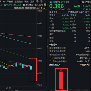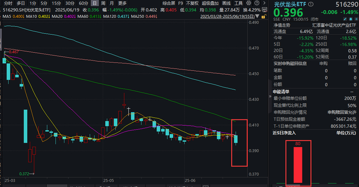 6月19日,黑色星期四再现,A股单边下行,两市成交额1.28万亿,环比小幅放量,逾4600股下跌。同类低费率的光伏龙头ETF(516290)收跌1.49%。