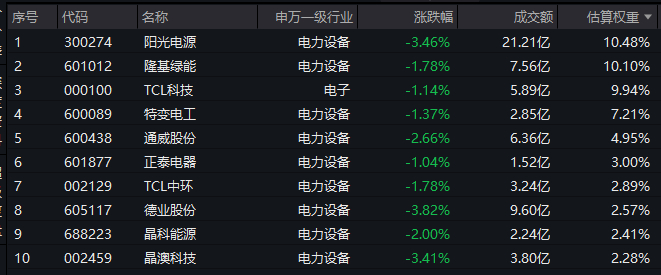 光伏龙头ETF(516290)标的指数成分股多数回调,阳光电源、德业股份、晶澳科技跌超3%,通威股份、晶科能源等跌超2%,隆基绿能、TCL科技、特变电工等跟跌。