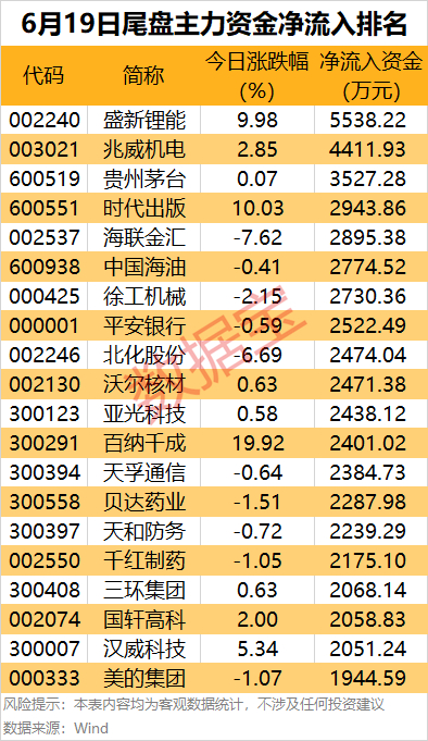 锂电股盛新锂能涨停,尾盘主力资金净流入5538.22万元,居首。还有兆威机电、贵州茅台、时代出版、海联金汇等尾盘主力资金净流入金额居前。