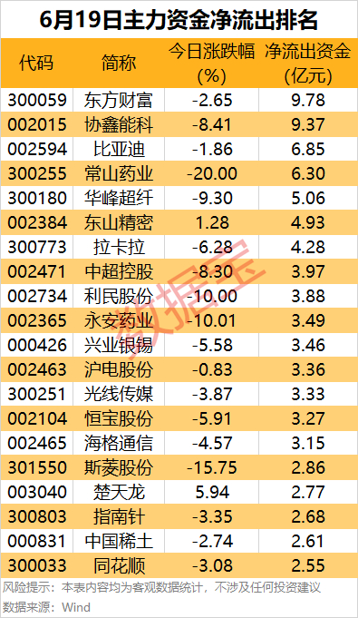 此外,还有比亚迪、常山药业、华峰超纤、东山精密、拉卡拉等热门股主力资金净流出金额居前。