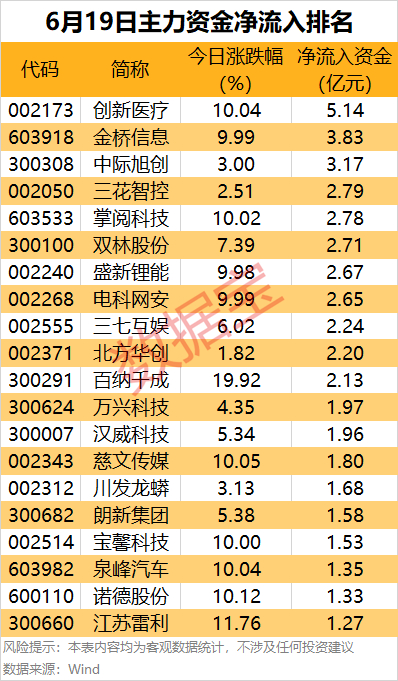 此外,中际旭创、三花智控、掌阅科技、双林股份等主力资金净流入均超2亿元。