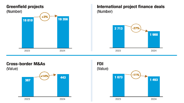 2024年,全球FDI达到1.5万亿美元,较去年下降11%。