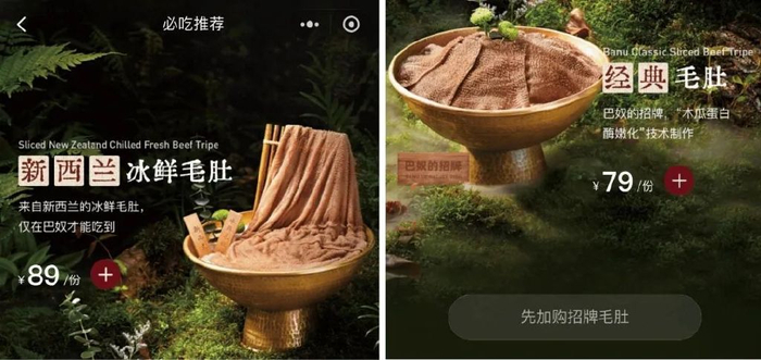 杜老板靠明星单品带动客单价,以毛肚产品为例,招牌“经典毛肚”的售价为79元/份,“新西兰冰鲜毛肚”为89元/份。