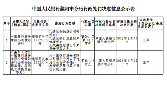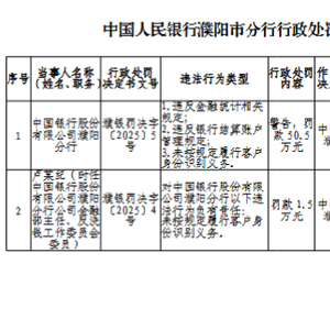 中国银行濮阳分行被罚50.5万元:违反金融统计相关规定、银行结算账户管理规定等