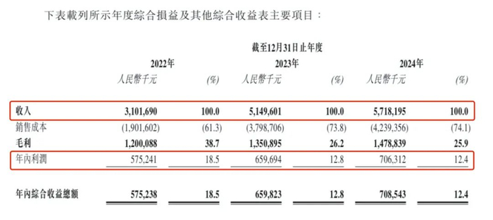 财务数据显示:2022-2024年营收分别为31.02亿元、51.50亿元、57.18亿元,年复合增长率35.8%;同期净利润为5.75亿元、6.60亿元、7.06亿元,年复合增长率10.8%。