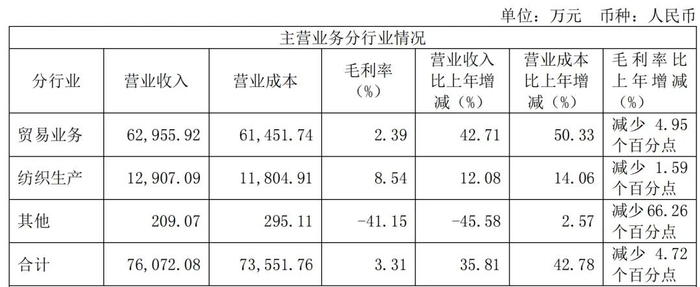 具体来看,按照行业分类,公司主营业务涵盖贸易业务、纺织生产和其他。2024年,公司在三大行业中的业务毛利率均出现下滑,分别下滑4.95个百分点、1.59个百分点和66.26个百分点。